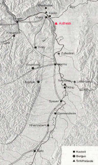 Karte "Spätantike Wehranlagen im südlichen Teil des Mainzer Dukates" aus J. Oldensteins "Neue Forschungen im spätrömischen Kastell von Alzey" in "Bericht der Römisch-Germanischen Kommission 67". |